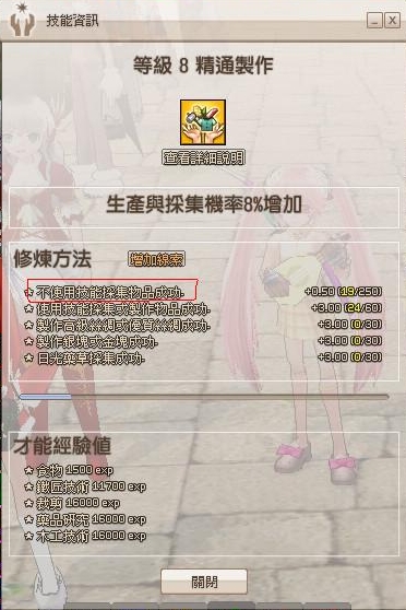 血色月牙 [ Lv.52 ] ? 2013-07-25 13:34:47 之所以會練到8才發現疑問 是因為我過去這技能都是在不知不覺間滿的 直到最近才注意到這修練項目 |