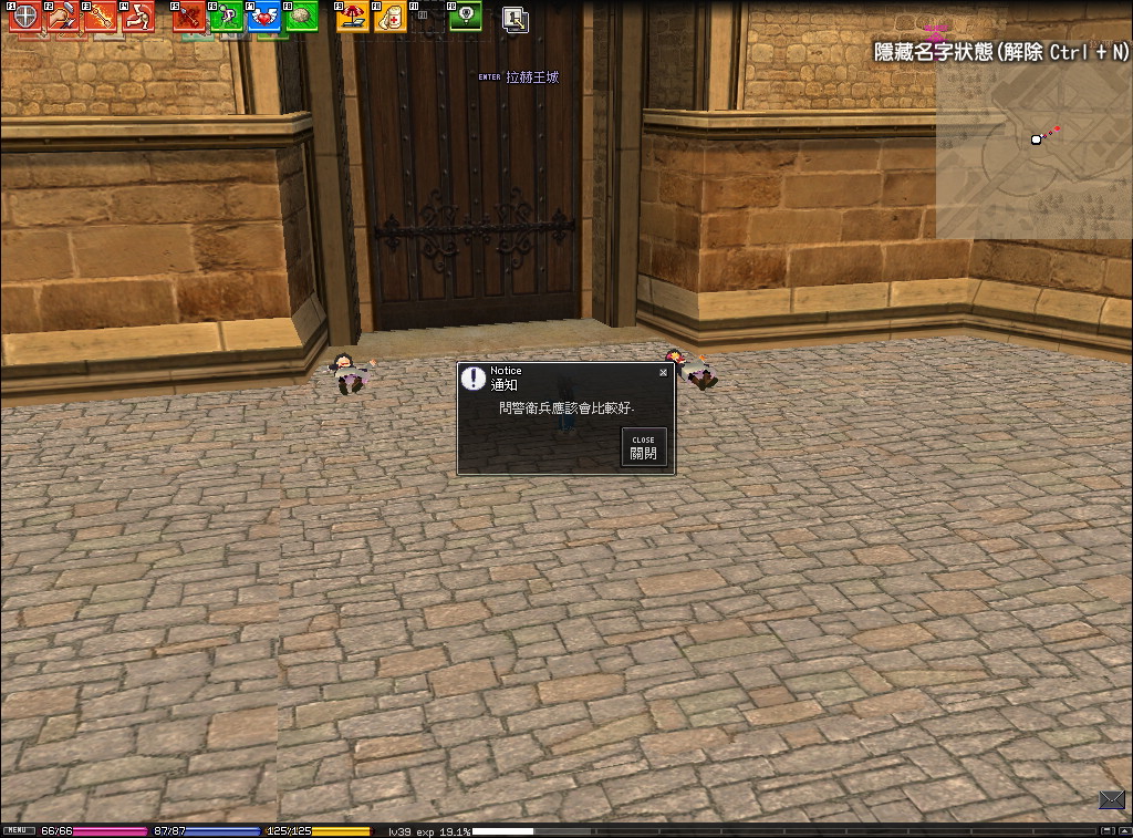 翔欸 [ Lv.41 ] ? 2011-07-21 22:58:41 守衛都死光 那還有其他辦法進去王城嗎 還是只能用工會石飛 |