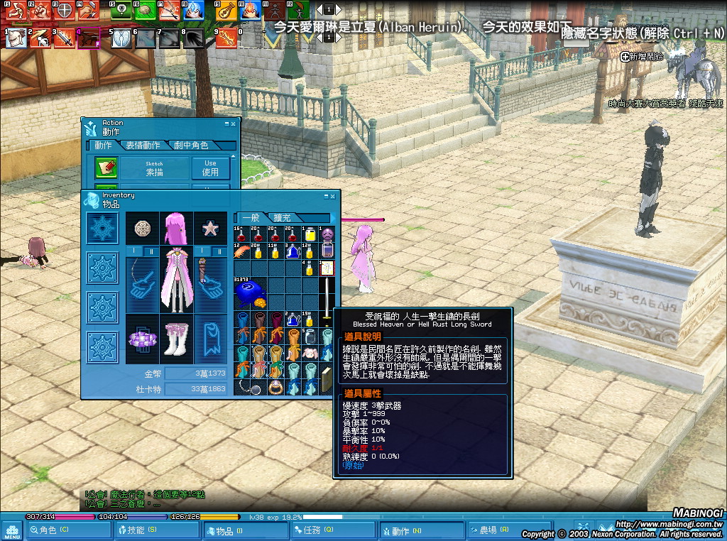 某希 [ Lv.35 ] ? 2012-01-19 00:07:52 本來抽到這劍很興致勃勃的拿在手裡然後在杜巴亂晃 沒半天打開背包來看發現它紅了…(沒耐意味 我什麼也沒做啊?! |